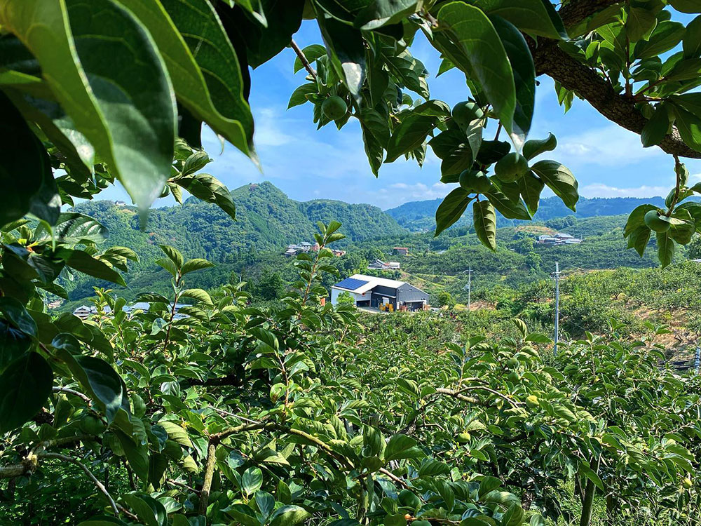 約12ヘクタールの広大な敷地の中で柿を中心にカリンやブルーベリー、桃、シャインマスカットの生産を行う。