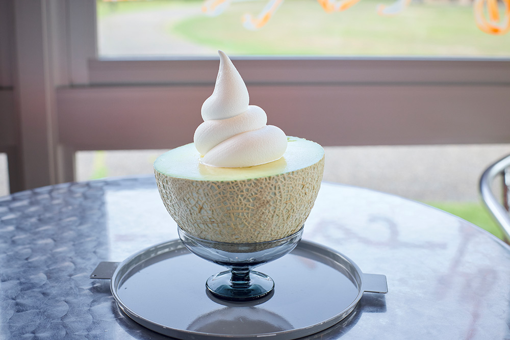 「メロン好きの夢を叶える」といっても過言ではないビジュアル。メロンを半分にカットし、ソフトクリームをたっぷりと入れたメニュー。