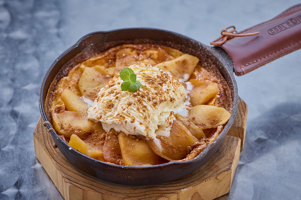 焼きりんごがたっぷり入ったダッチベイビーパンケーキ。果物のおいしさをぎゅっと凝縮。