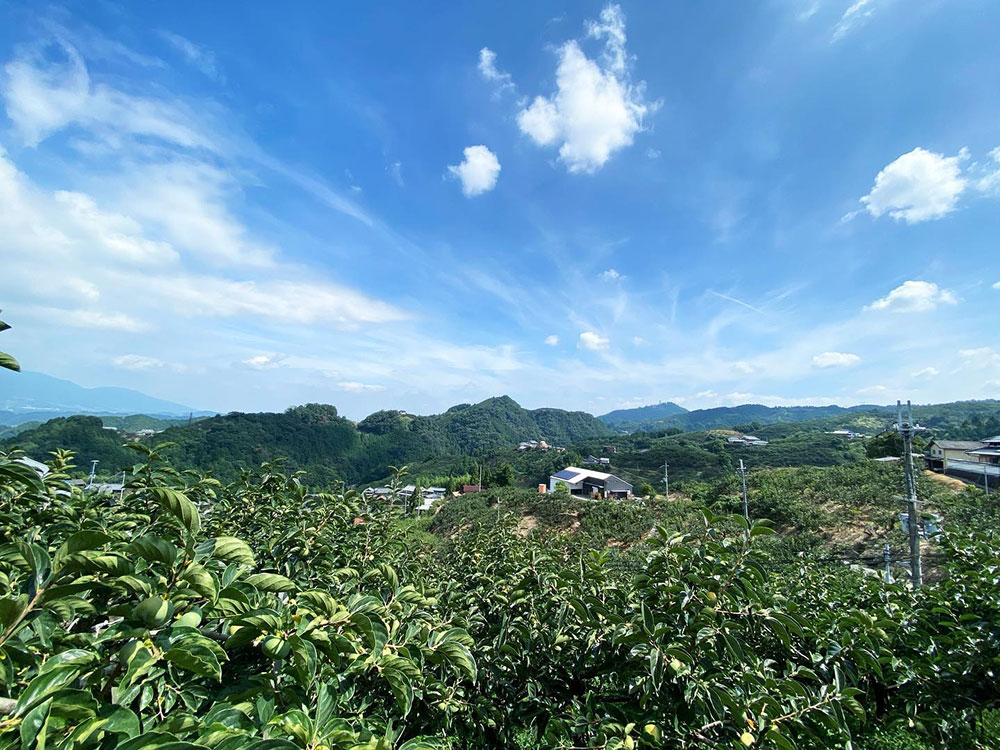 堀内果実園の農園の風景。五條の美しい緑、青空が印象的。
